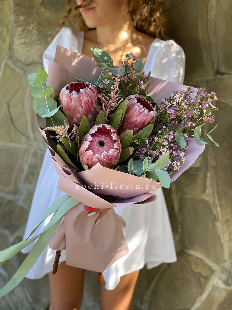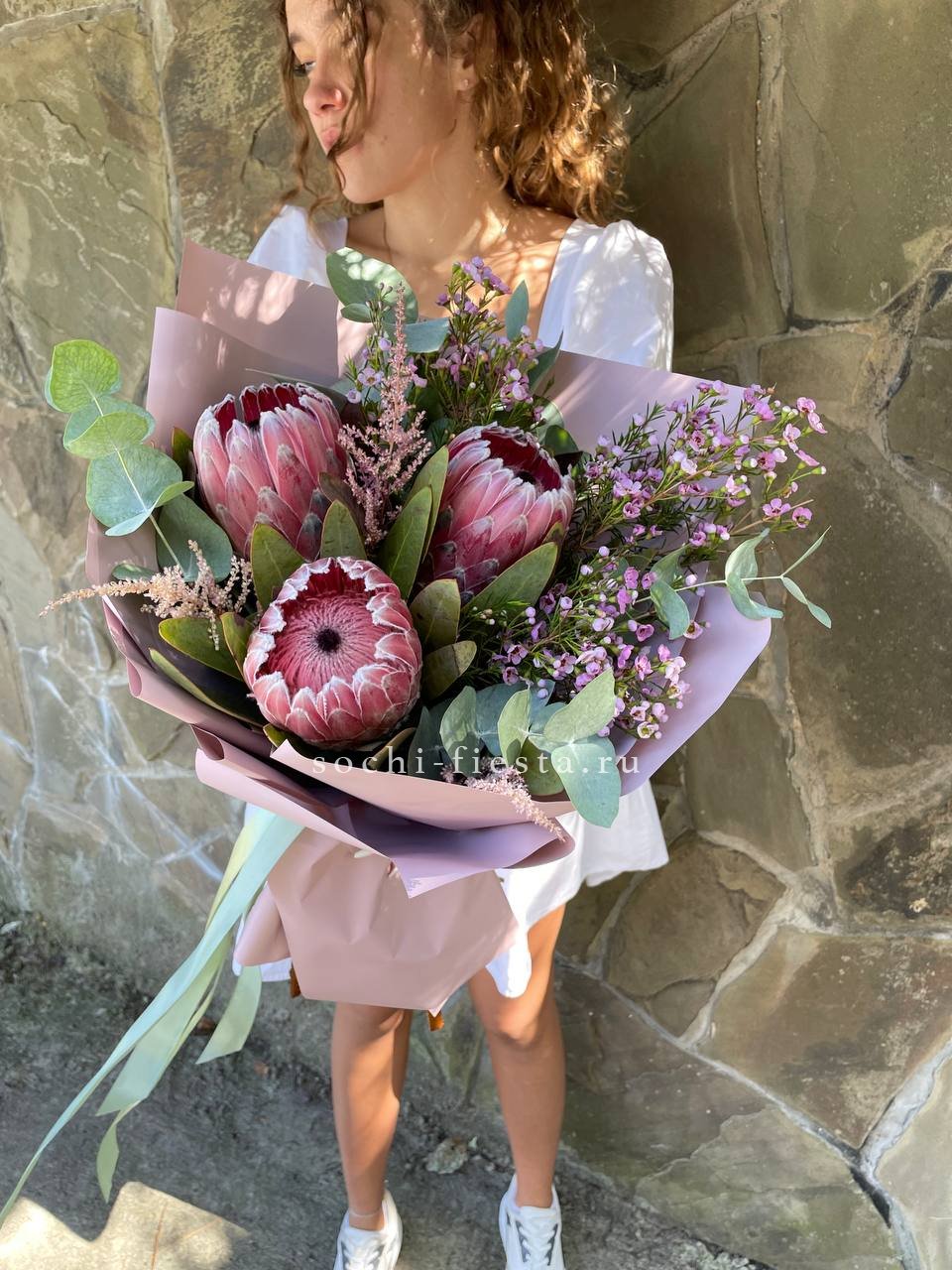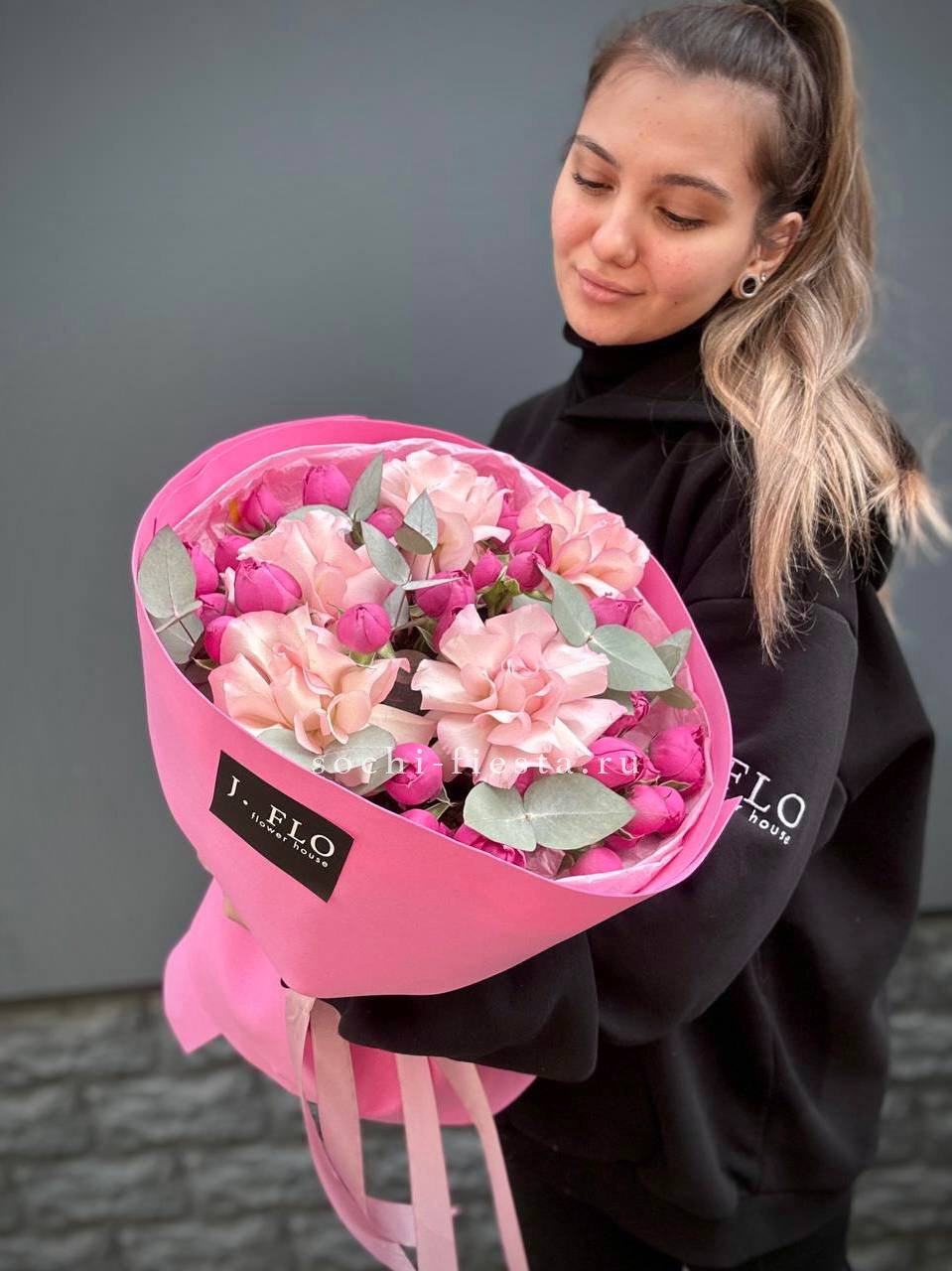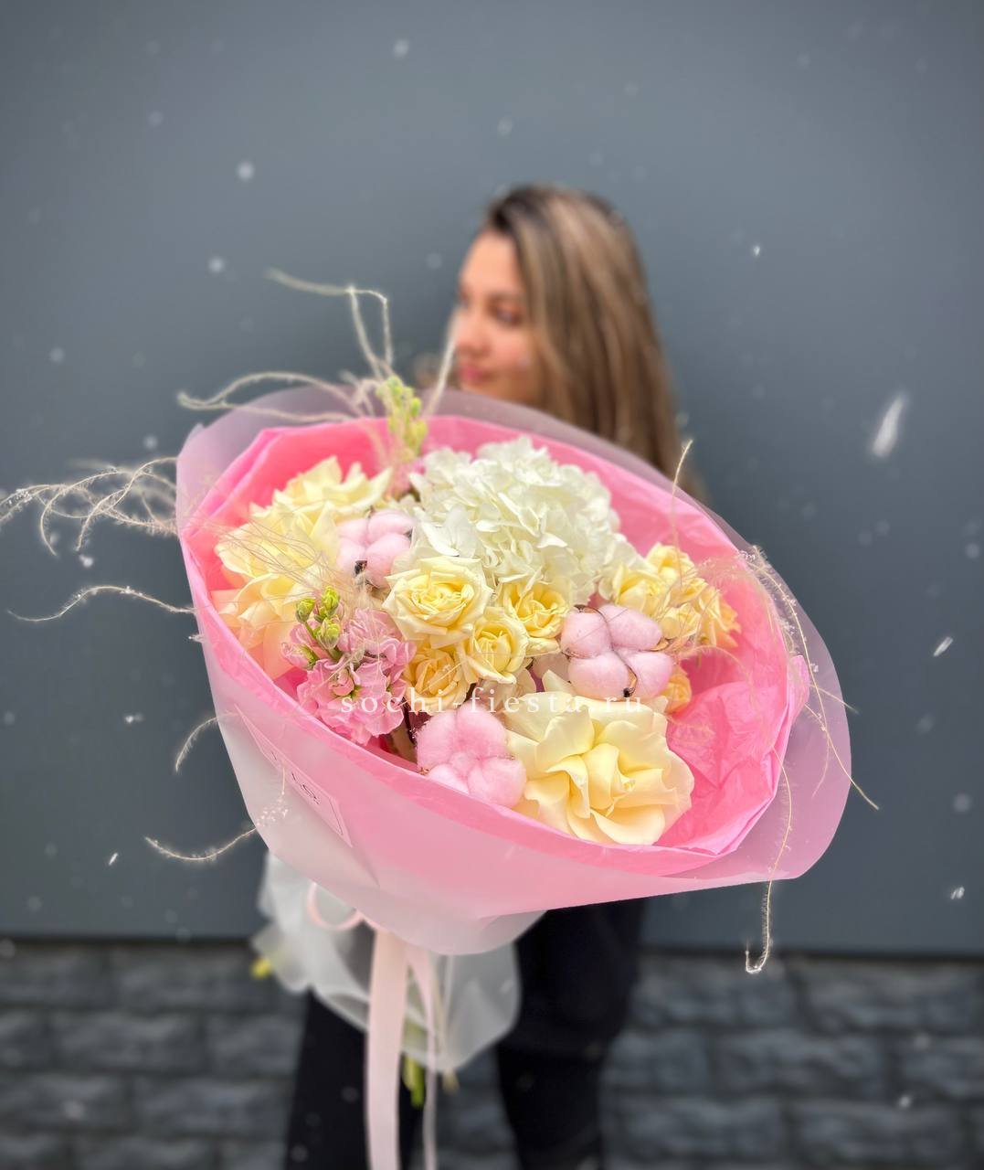 Плотные головки Мисти Бабблс раскрываются слоями и создают объёмную текстуру рядом с классическими бутонами. Белый и розовый перетекают друг в друга без резких границ. Композиция собрана в обёртку с графичным рисунком для современной подачи.