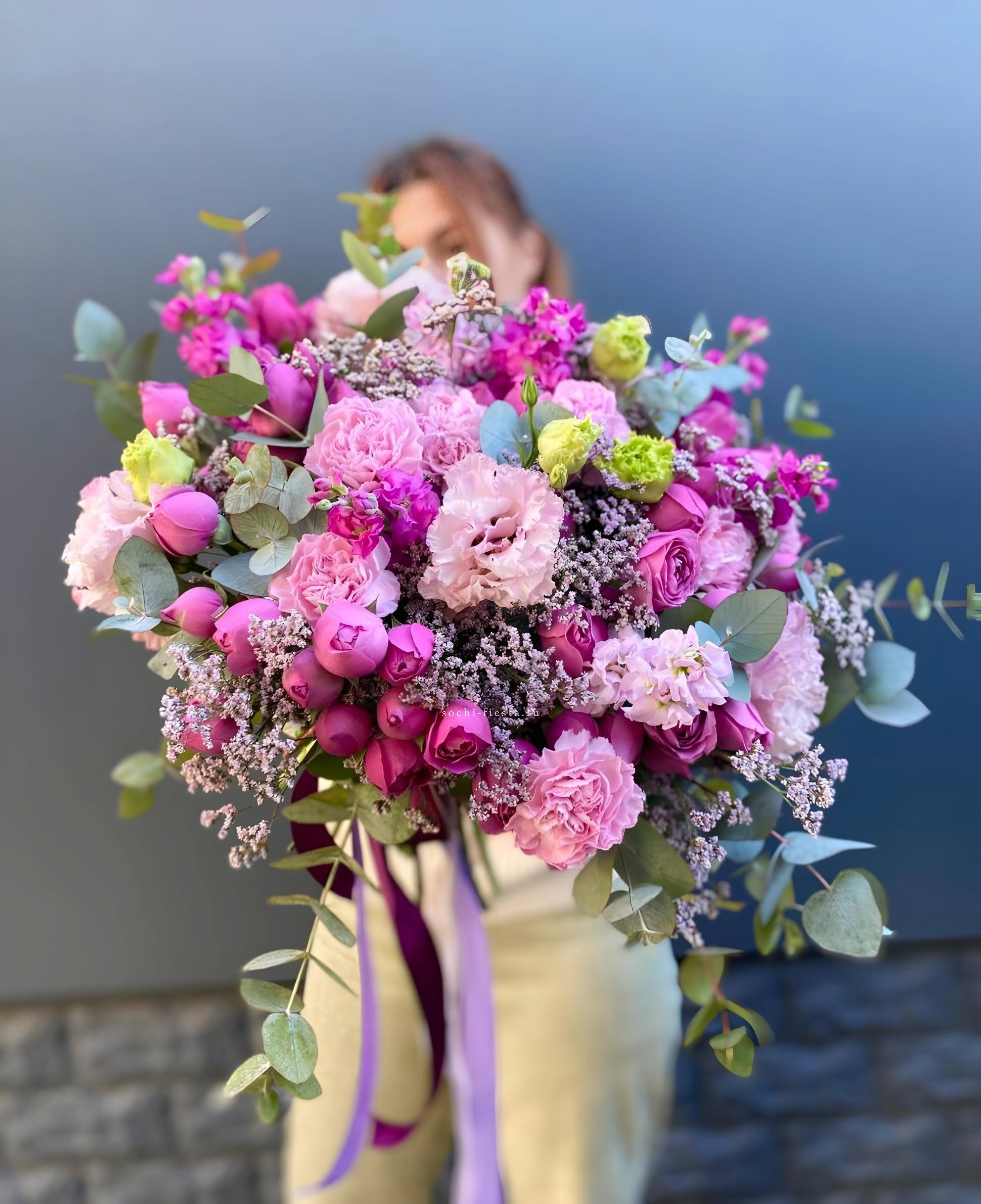 хризантема кустовая, гортензия, мисти баблс, розы в нежном оформлении.